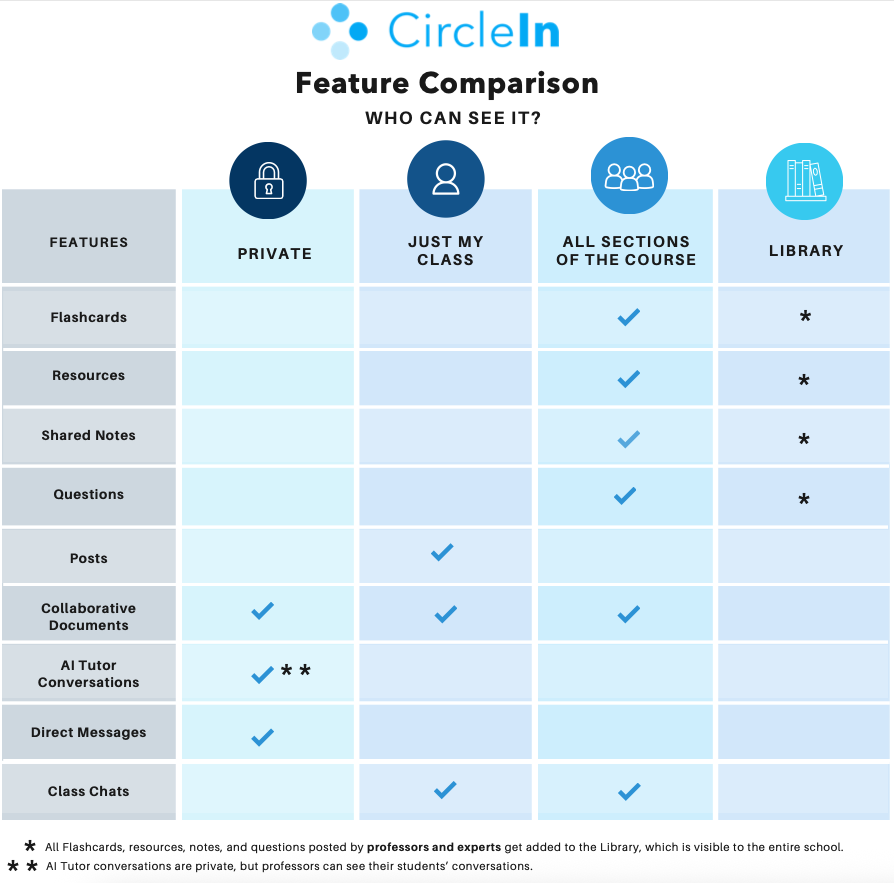CircleIn feature comparison chart titled “Who Can See It?” The chart compares visibility of features under four categories: Private, Just My Class, All Sections of the Course, and Library.  Flashcards, Resources, Shared Notes, and Questions — visible to all sections of the course and added to the library if posted by professors or experts.  Posts — visible only to the class.  Collaborative Documents — visible privately or to all sections.  AI Tutor Conversations — private, but professors can view their students’ conversations.  Direct Messages — private.  Class Chats — visible to the class.  Footnotes:  Professors’ and experts’ Flashcards, Resources, Notes, and Questions are added to the Library.  AI Tutor Conversations are private but visible to professors for their students.CI provides one place for students to chat, create and share flash cards, post class notes, ask questions, share videos, DM each other, create quizzes, study using an AI Tutor – all in a mobile app. Students can also provide weekly feedback on what they’ve learned or may not understand. This feedback goes directly to their instructors as part of their instructional strategy.